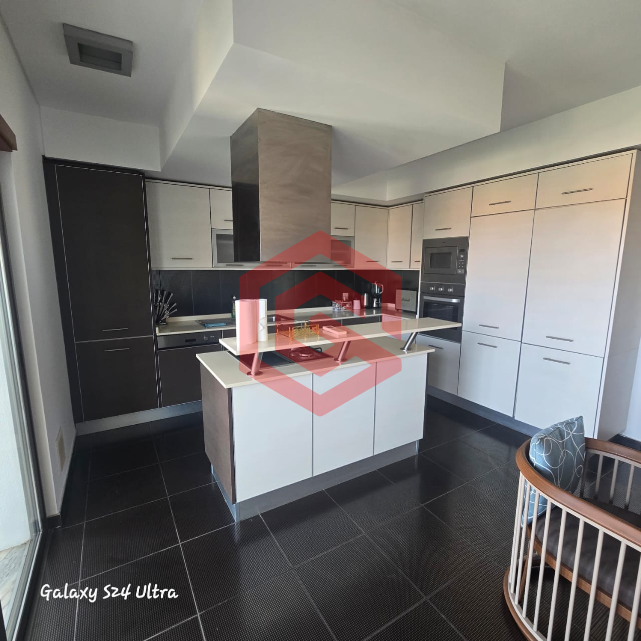 Cozinha equipada com armários embutidos, fogão, forno elétrico, micro-ondas, máquina de lavar roupa e louça