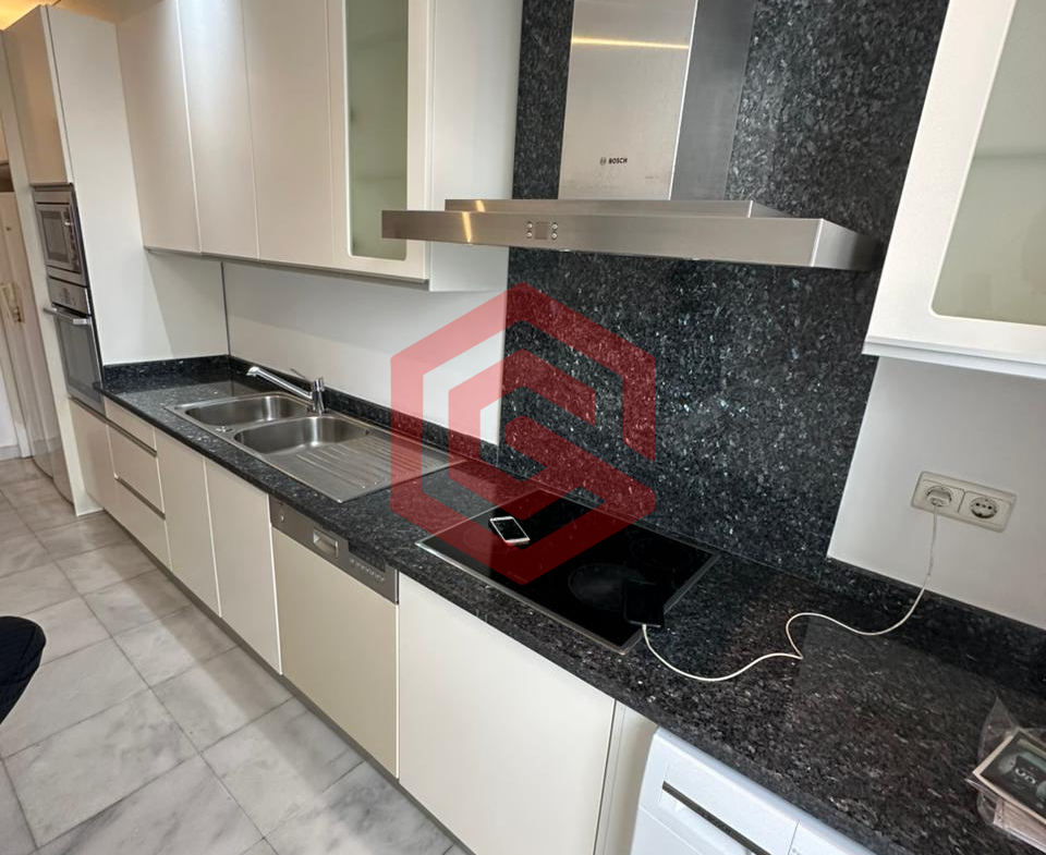 – Cozinha equipada com fogão, micro-ondas, geladeira, armários, máquina de lavar louça e máquina de lavar roupa