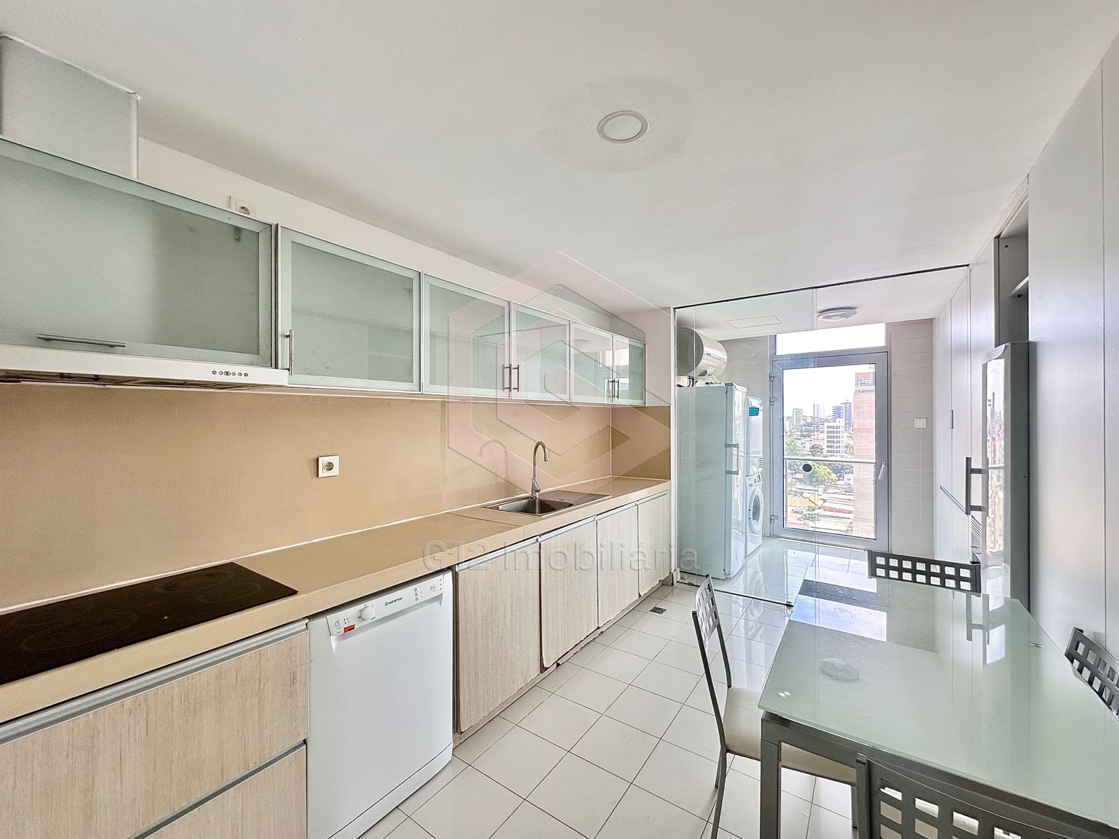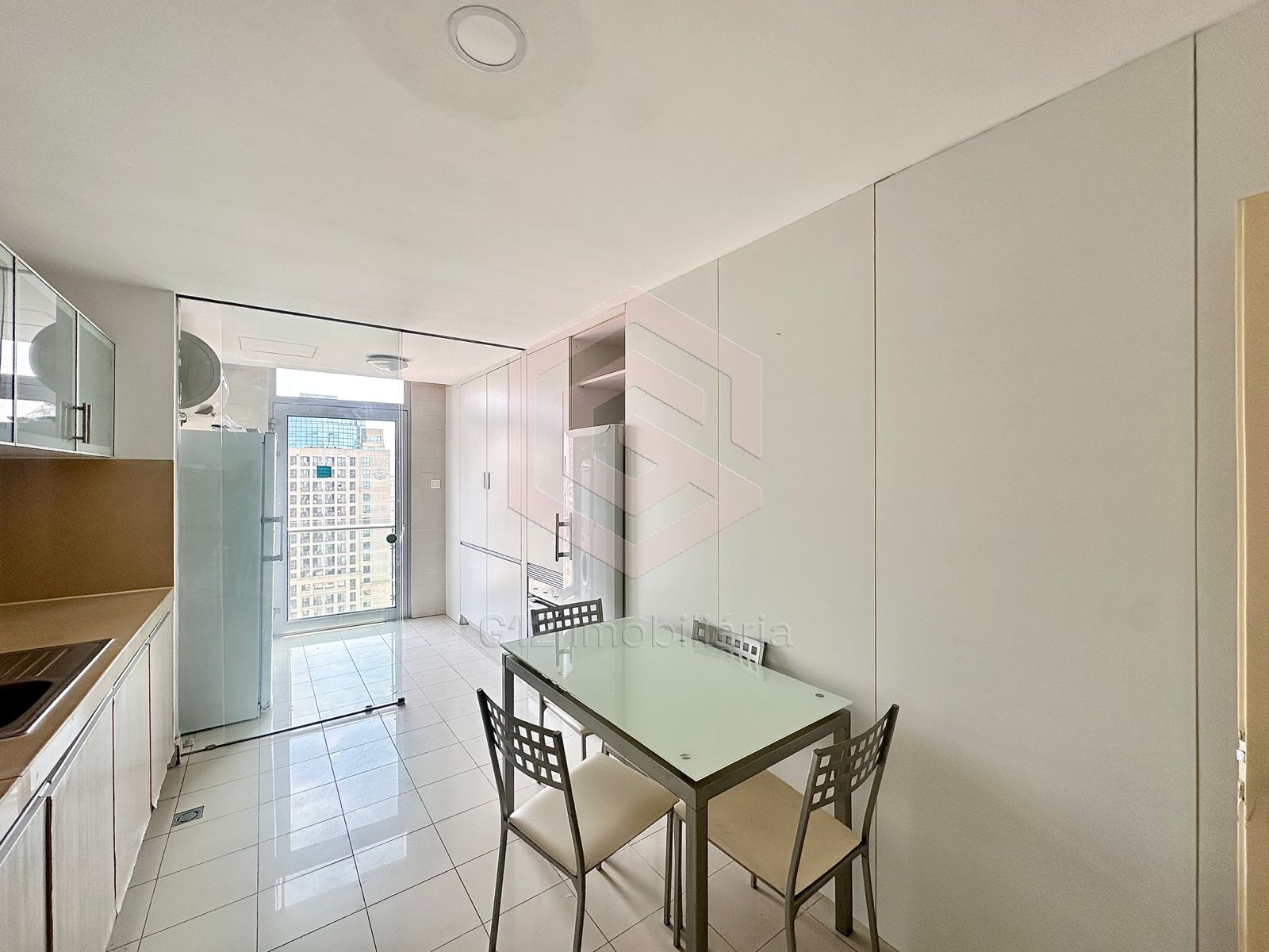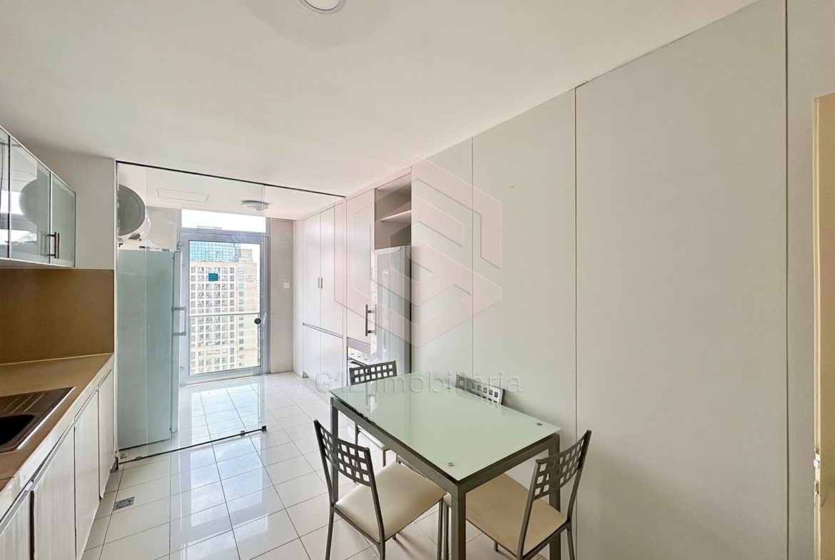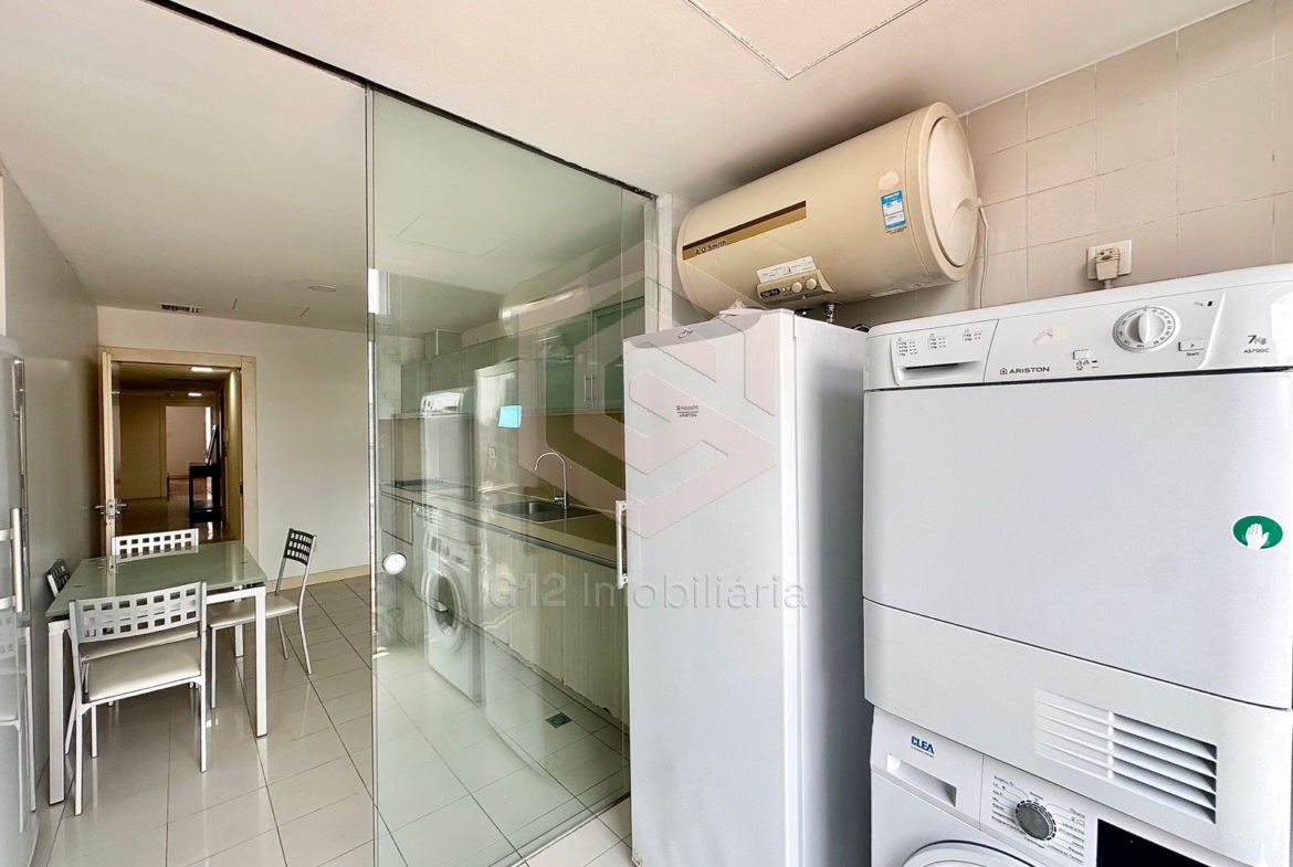 – Cozinha equipada com armários embutidos, fogão, forno elétrico, micro-ondas, máquina de lavar roupa e louça