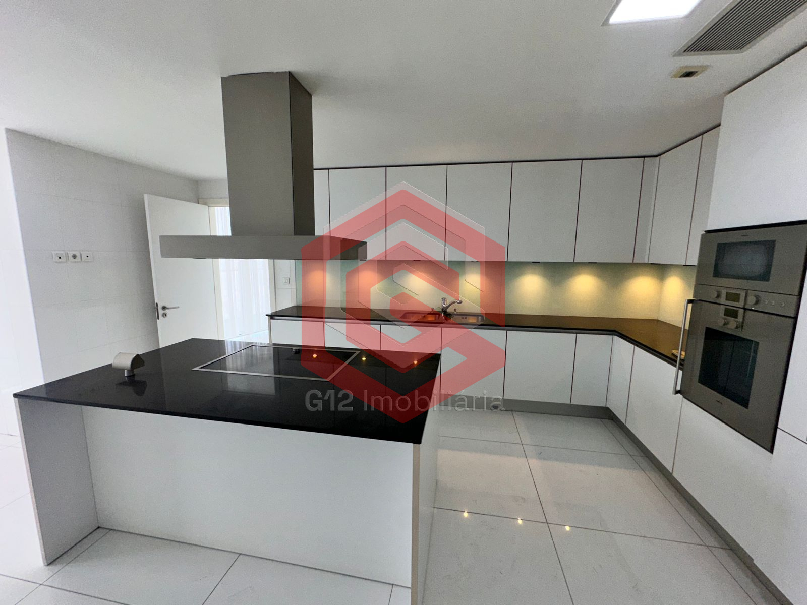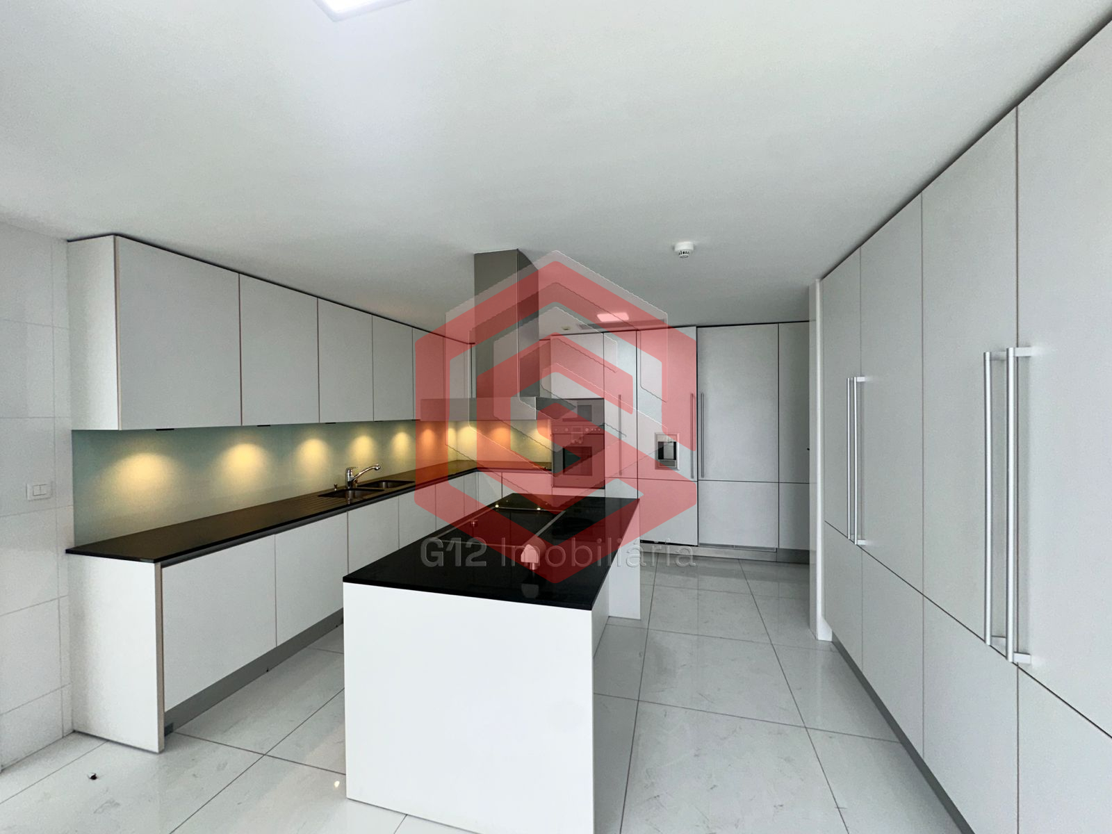 – Cozinha com armários embutidos em mármore preto e ilha para preparação de alimentos, equipada com geladeira, máquina de lavar roupa, máquina de secagem e máquina de lavar louça
