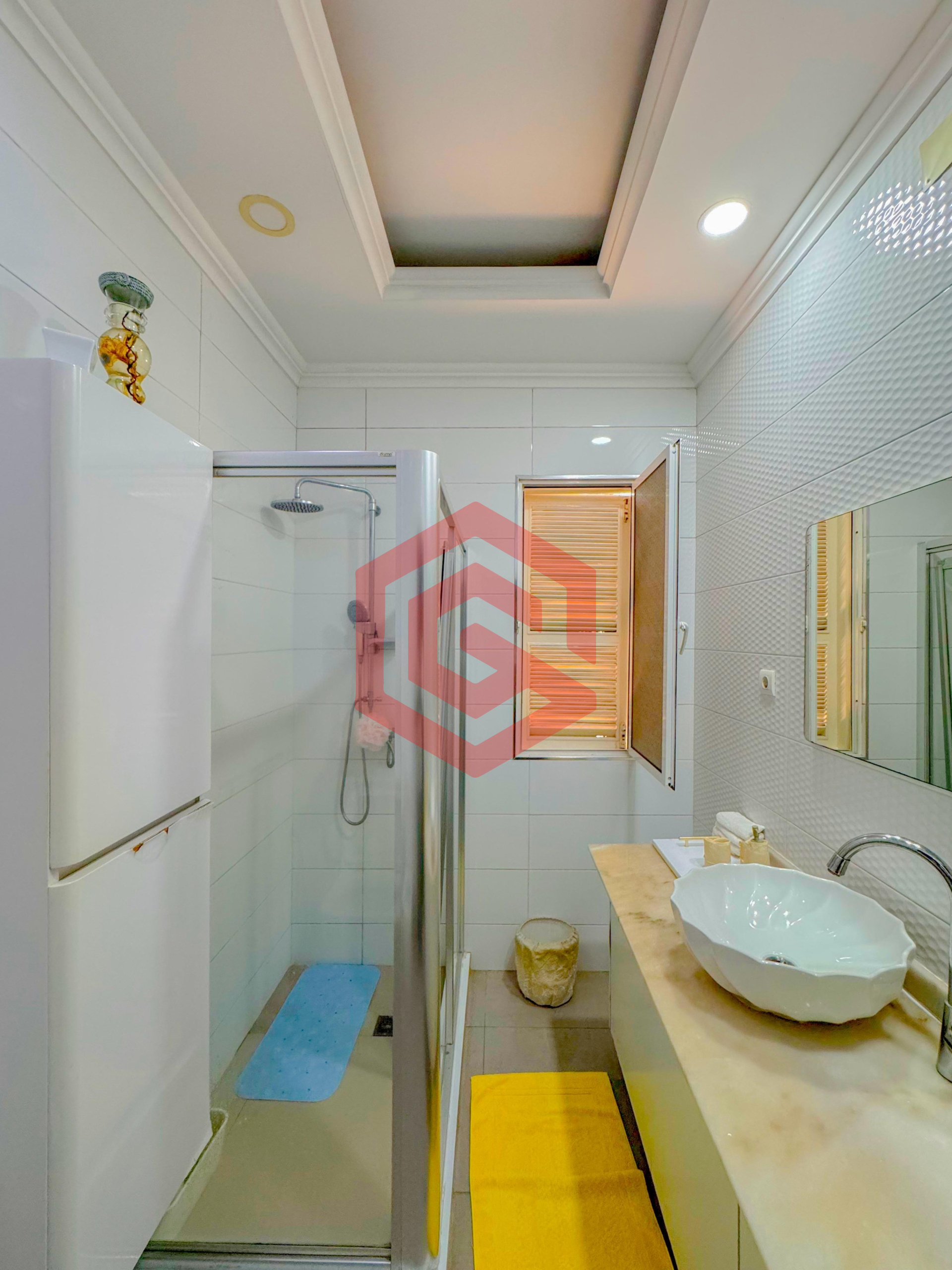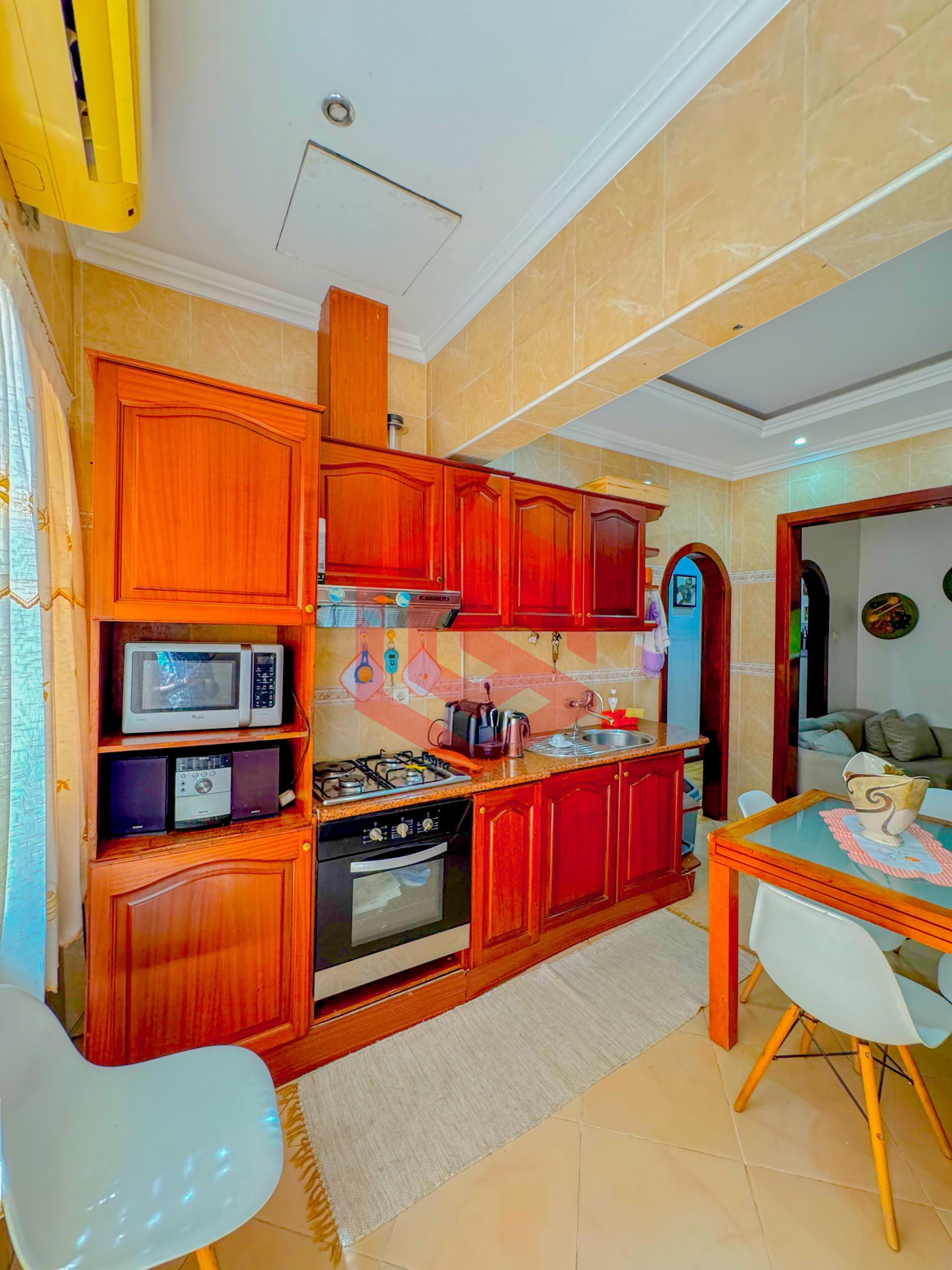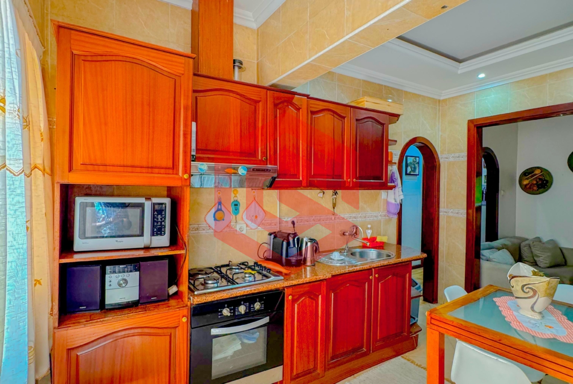 – Cozinha equipada com armários embutidos, frigorífico, fogão, forno elétrico, micro-ondas, máquina de lavar roupa e máquina de lavar louça