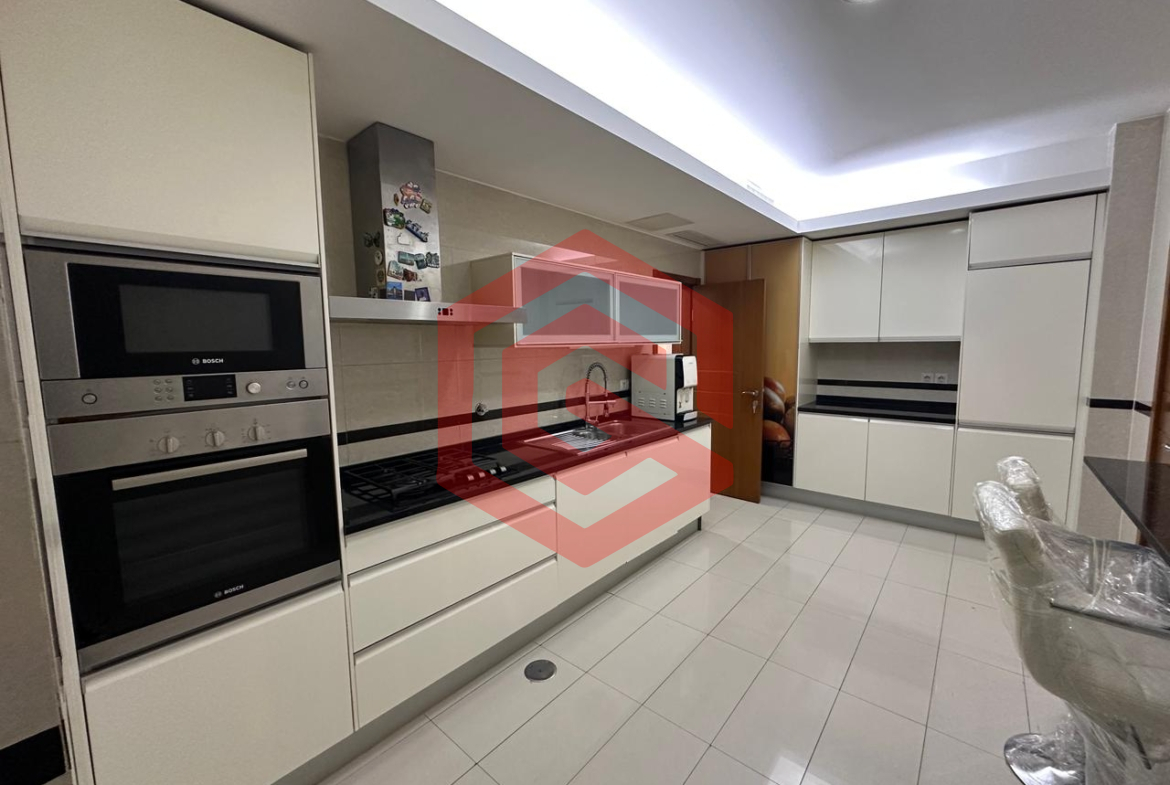 – Cozinha equipada com armários embutidos, fogão, frigorífico, forno elétrico, micro-ondas, máquina de lavar roupa e máquina de lavar louça